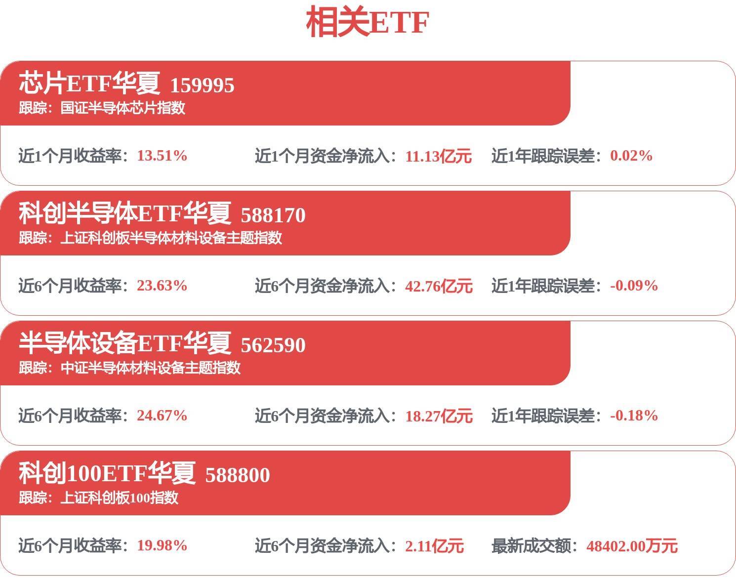 4月27日,三大股指早盘窄幅震荡,其中半导体设备板块大幅拉升。截至上午11:00,半导体设备ETF华夏(562590)涨5.47%。相关成分股中,北方华创涨8.56%、江丰电子涨8.51%、中科飞测涨7.97%,中微公司、长川科技、拓荆科技等小幅跟涨。(以上所列股票仅为指数成份股,无特定推荐之意)