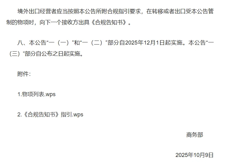 其中部分条款自12月1日起实施,原产于中国的物项即日起执行。