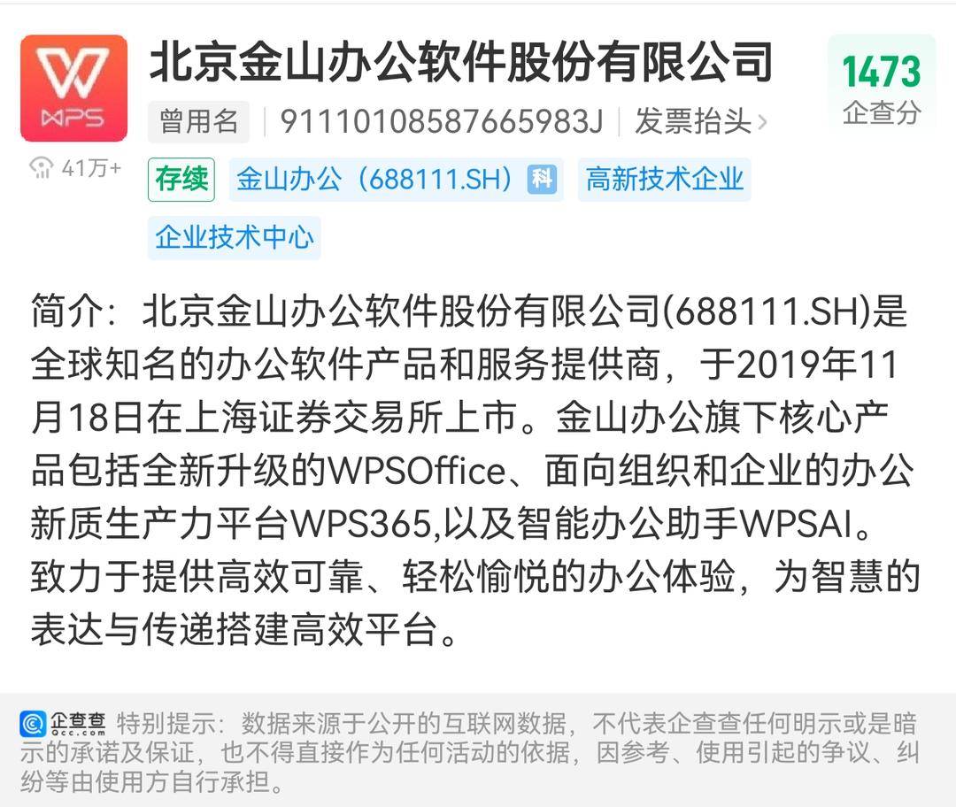 A股市场方面,10月10日,金山办公(688111)收报297元/股,总市值1376亿元。