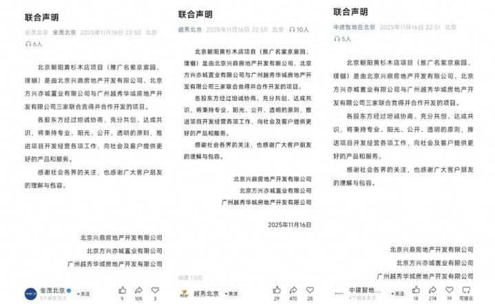 昨天半夜,中建智地、越秀北京和金茂北京,像约好了似的,掐着点同时发了一份联合声明。