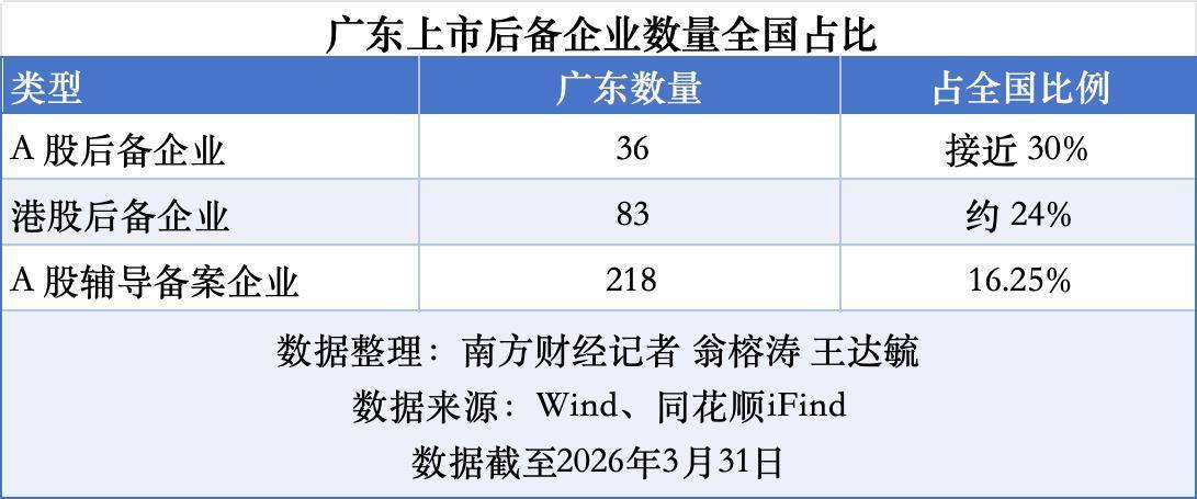 数据显示,截至2026年3月底,广东境内外IPO后备军团总量达119家,较2025年3月底的32家大幅增长280%。其中,A股后备军团36家,同比增长112%,占全国比例接近30%;港股后备军团83家,同比大涨超450%,占全国比例约为24%;A股辅导备案企业218家,占全国比例为16.25%,上述三项占比均位居全国第一。