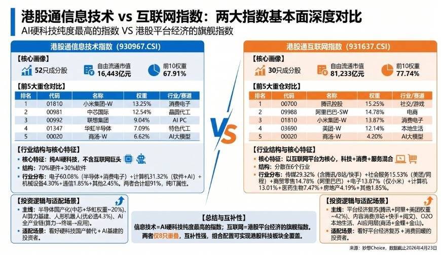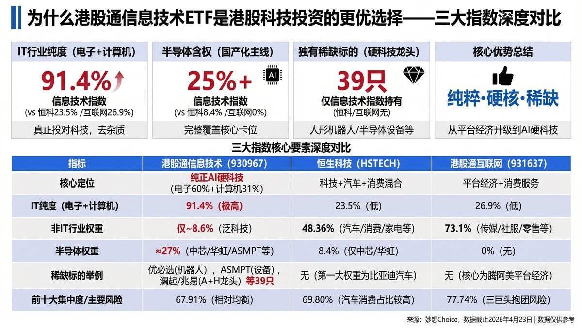 指数本质IT纯度适合谁恒生科技"泛科技"24%想买港股龙头的宽基投资者港股通互联网"平台经济"27%看好互联网平台复苏的投资者港股通信息技术"纯AI硬科技"91%真正看好AI硬件+半导体+机器人产业链的投资者
