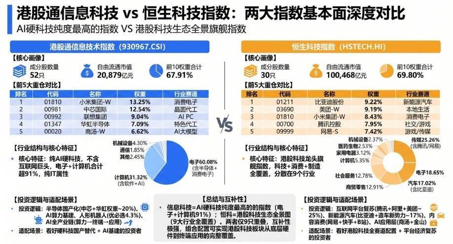 港股通信息技术指数(930967)严格限定投资范围,彻底剔除腾讯、阿里、美团、快手等互联网平台巨头,专注电子、计算机、机器人等纯正信息技术领域,直指半导体与AI算力基建核心。
