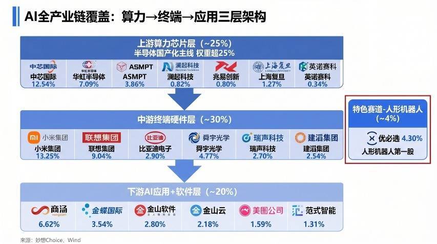 算力层(半导体+设备):中芯国际、华虹半导体、ASMPT、澜起科技,合计约24.3%