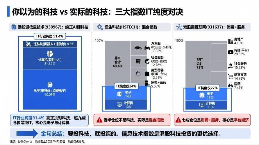 真相:恒生科技仅24%是纯正IT,港股通互联网仅27%是纯正IT。剩下的全是汽车、消费、平台、地产……你以为买的是AI硬科技,实际上拿到的是一锅"科技大杂烩"。